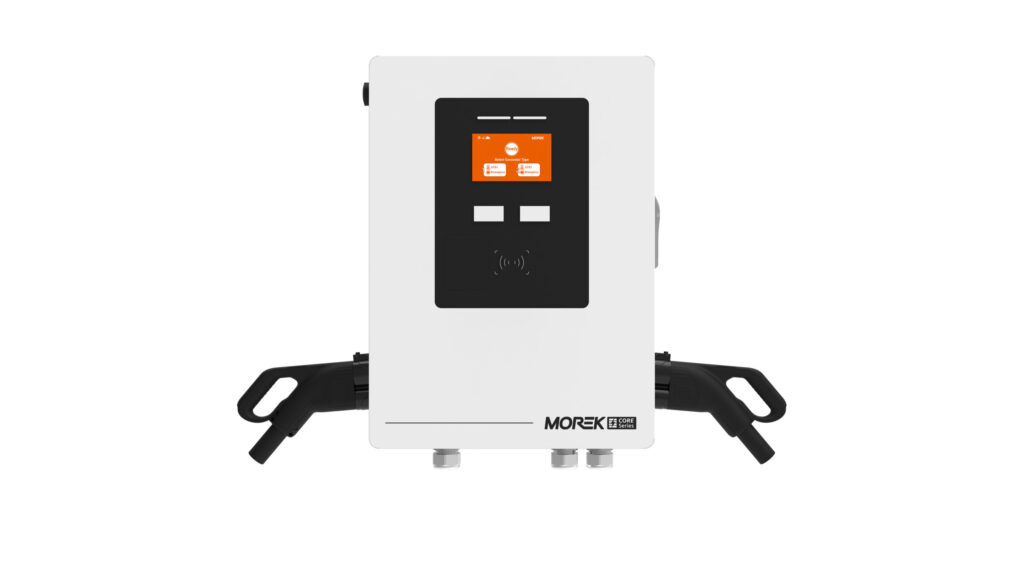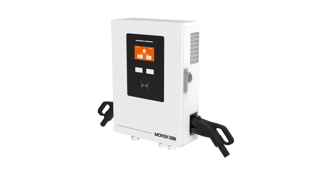 The charger is designed for wall-mounted or stand-mounted installation and features two CCS2 connectors with integrated 5 m charging cables. Integrated power distribution enables efficient energy allocation between two simultaneously connected vehicles. Charging sessions can be initiated via RFID cards, web app, user app, QR code, or manual start directly from the touchscreen HMI.